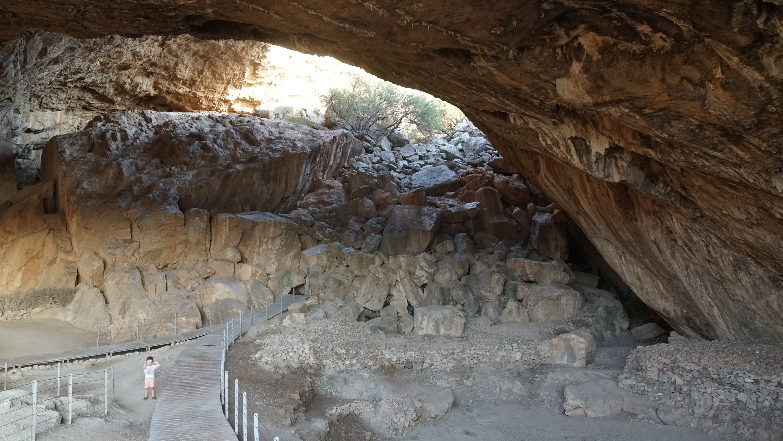 Die schieren Ausmaße der Höhle sind imposant, und machen sie einen Ausflug wert. Erste Besiedelungsspuren datieren auf bis vor 7000 Jahren zurück, das wird vor Ort sehr anschaulich erklärt. Wir empfehlen einen Nachmittagsausflug und die Eroberung der Höhle zu Fuß. Das Auto kann man an diesem Strand parken und dann in ca. 20-30 Minuten einen schönen Weg am Meer entlang zum Höhleneingang laufen (den roten Pfeilen nach). Wer in der Höhle auf eigene Gefahr noch ein kleines Abenteuer drauf setzen will, geht am griechischen Hinweis-Schild vorbei und klettert die Steinblöcke hoch. Von dort aus kann man weitere Teile der Höhle erkunden.